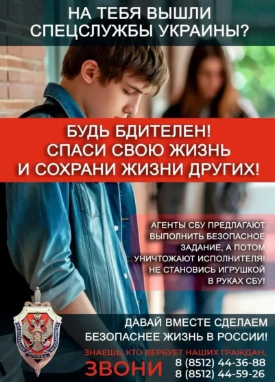 Уважаемые родители! Внимание!Ваш ребенок может быть завербован - украинские спецслужбы склоняют молодежь к диверсиям. В соцсетях преступники втираются в доверие к молодым людям и под разными предлогами убеждают совершить теракт. Затем исполнителя могут уничтожить, заметая следы.За такие преступления грозит очень серьезная уголовная ответственность! Предупредите близких и будьте бдительны.Сообщите в правоохранительные органы по номерам 44-36-88 и 44-59-26, если знаете, что ваших знакомых пытаются завербовать.